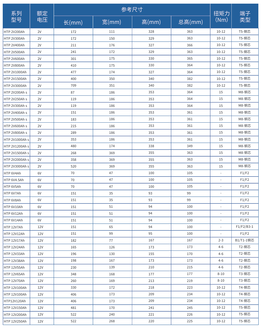 HTP系列蓄電池是通用型鉛酸蓄電池。采用多元高錫合金配合特殊板柵結(jié)構(gòu)和低酸密 度設(shè)計,提高了板柵的耐腐蝕性能和延長了電池使用壽命。同時,高質(zhì)量玻璃纖維(AGM)隔 板完全吸收電解液,確保內(nèi)部無游離酸,提高了內(nèi)部裝配的壓力,增加了電池的安全性和穩(wěn) 定性。成熟的穿壁焊熱封工藝使電池內(nèi)阻更低,且擁有大功率性能和更高的比能量。外殼采 用高強度ABS材料,提升使用安全性。全系列產(chǎn)品都采用國際先進的自動化生產(chǎn)線制造,嚴(yán) 格的生產(chǎn)控制過程確保了產(chǎn)品的一致性和穩(wěn)定性。